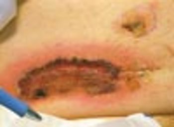 Two weeks after undergoing a laparoscopic partial nephrectomy for renal adenocarcinoma, a 78-year-old man with myelodysplastic syndrome was hospitalized with nonhealing abdominal wounds. The patient had started a course of oral cephalexin 4 days before admission to treat erythematous areas at 2 of the trocar port sites.