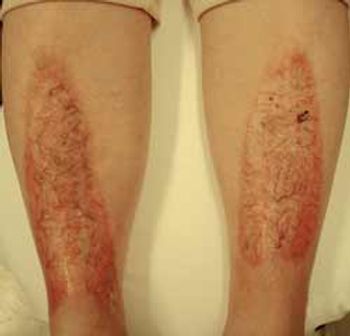 A 63-year-old woman sought evaluation of asymptomatic, nontender, gradually progressing bilateral plaques on her shins. The lesions had arisen 8 months earlier as small, firm, red papules that spread peripherally. The papules had enlarged and developed atrophic centers. The patient had no history of glucose intolerance or diabetes.