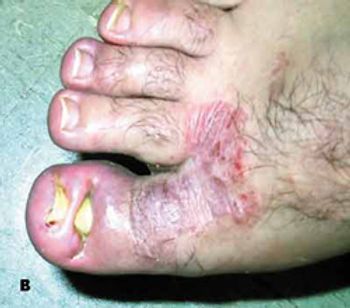 These patients have chronic paronychia. This inflammatory nail bed disorder is usually caused by prolonged exposure to wet environments and repeated minor cuticle trauma. Christopher Montoya, PA-C, of Beaverton, Ore, and Timothy R. Hurtado, DO, of Yongson, Korea, report that the nails of a 33-year-old man's right index finger and ring finger displayed multiple lateral grooves and edema near the eponychium.