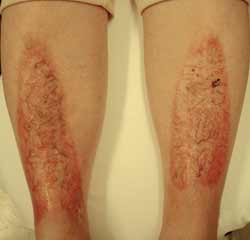 A 56-year-old man presents with diffuse erythema. He has not changed his routine or eaten anything unusual. The rash initially appeared the previous night as asymptomatic erythema on the face and body. On awakening in the morning, the patient noticed that the erythema had spread over most of his body and had become pruritic. Over-the-counter diphenhydramine did not relieve the symptoms.