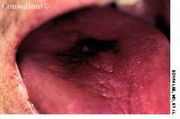 A 35-year-old HIV-positive man had a thick, black, otherwise asymptomatic patch on the top of his tongue. He did not have diabetes.