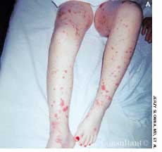 The onset of atopic dermatitis can be seen in infants who have a family history of inhalant allergies, (eg, seasonal allergy, allergic rhinitis, or allergy-induced asthma). The cheeks and large flexural folds of affected children are erythematous and scaly. Involved areas of the trunk and extremities may exhibit discrete patches or a generalized rash.