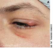 A 23-year-old woman presented with a painful, draining lesion on her right upper eyelid. The draining had begun several days earlier; tenderness and swelling had been present for at least 2 weeks. The patient denied having had similar eyelid lesions in the past.