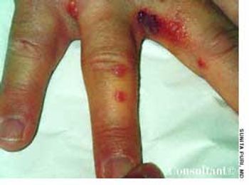 A 44-year-old woman had a painful, burning rash for 4 months. The erythematous eruption was evident on the thighs, fingers, buttocks, abdomen, and perineal and intergluteal areas. Application of triamcinolone cream and emollients offered no relief.