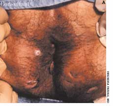 A 45-year-old man sought medical advice after suffering for 6 months with recurrent pain and a purulent discharge at the sacrococcygeal region. Two weeks before this consultation, an abscess on the patient's right buttock had been drained by another physician. The patient had insulin-dependent diabetes mellitus for 5 years; his medical history was otherwise unremarkable.