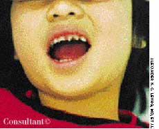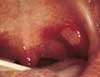 A 10-year-old girl complained of slight fatigue and malaise. A 6-mm tense blister had developed on the dorsum of her right foot, lesions had arisen on the palms, and a pinpoint, whitish ulcer had erupted anterior to the frenular attachment.