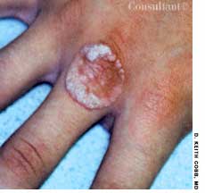 For several weeks, a 78-year-old woman had an intensely pruritic, diffuse, raised, slightly scaly, erythematous rash that persisted despite the use of several over-the-counter topical medications (such as hydrocortisone and clotrimazole cream). Since her last visit about 3 months earlier for a blood pressure reading, she had been well except for 2 episodes of night sweats. For several years, she had been taking levothyroxine and reserpine/hydrochlorothiazide; about 6 months ago, valsartan/hydrochlorothiazide had been prescribed.