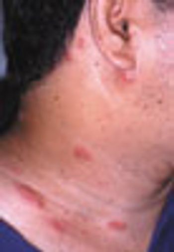 A 37-year-old man presents for evaluationof 3 reddish, tender, 2-cm, elevatedlesions on his right ankle that havefailed to respond to oral amoxicillin/clavulanate prescribed by anotherphysician. The lesions have beenpresent for 8 weeks. Each lesion has acentral opening and watery yellow drainage (Figure 1). The patient recentlyreturned from a trip to CentralAmerica, where he had sustained multiplemosquito bites.