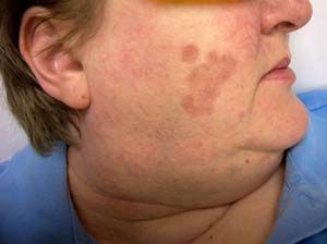 This solitary, very pruritic, annular lesion suggests dermatophytosis. KOH preparation verified the presence of Tinea faciei. This infection is usually associated with contact with a new kitten or puppy.