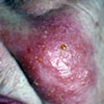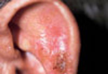 A tender, crusting eruption first arose on a 69-year-old man’s ear 10 days earlier; an antibiotic failed to clear the lesion.