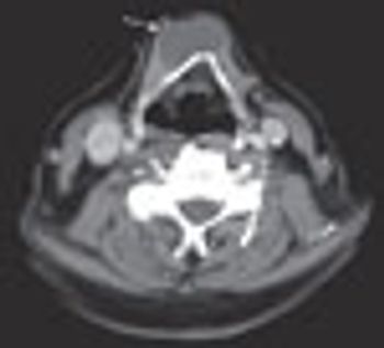 A 48-year-old man was admitted with a sore throat, subjective fever, and cough of 2 days’ duration. Two days before admission, he had dysphagia, began to drool, and felt like he was choking.