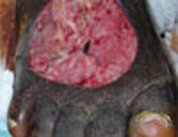 This painful, purulent, malodorous, 5 x 5-cm ulcer developed a few days after the 71-year-old patient had struck his foot against a radiator. For the past 24 hours, he had subjective fevers and chills. He denied recent travel and saltwater or freshwater exposure. He had chronic lymphedema and admitted to drinking alcohol socially.