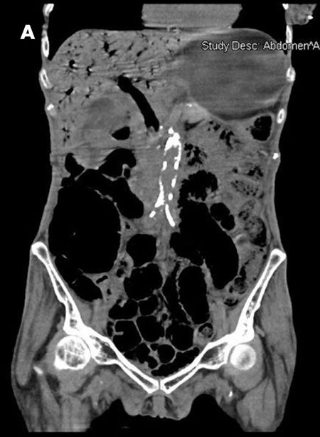 A 77-year-old woman with hypertension, diabetes mellitus with neuropathy and nephropathy, coronary artery disease, and previous stroke with residual right hemiparesis was hospitalized because of abdominal pain, nausea, and vomiting of sudden onset. She also reported subjective fever, dysuria, and foul-smelling urine.