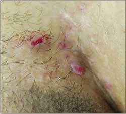 For 1 month, a 54-year-old woman has had an intensely pruritic eruption on her abdomen, arms, and anterior thighs. She has long-standing hypertension and type 2 diabetes mellitus, which are treated with an angiotensin-converting enzyme inhibitor/diuretic and an oral hypoglycemic agent.