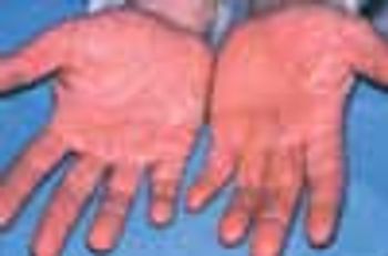 For as long as he could remember, a 27-year-old man had had a recurrent eruption on the palms and sides of the fingers. The rash was characterized by intense pruritus followed by the formation of small water blisters and increased perspiration that resolved with peeling of the skin. The dorsa of the hands were unaffected. Results of a potassium-hydroxide preparation and fungal culture of skin scrapings were negative for hyphae. The thyrotropin level was normal.