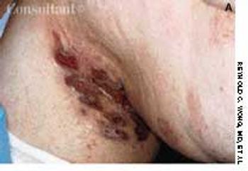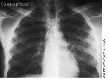 With a 1-year history of episodic wheezing, a 62-year-old woman (a smoker for the past 30 years) was being treated for bronchial asthma, but bronchodilator therapy did not control her symptoms. She was hospitalized with worsening dyspnea and a 4.5-kg (10-lb) weight loss over the past 3 months. There was no hemoptysis.