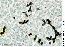 An 85-year-old man was admitted to the hospital with acough and shortness of breath of 1 week’s duration anda fever and increased sputum production for 2 days. Hishistory included renal cell carcinoma and metastatic renalcancer for 2 years. The patient had smoked cigarettesfor 30 years. He had lost 30 lb during the last few months.A chest film revealed pneumonia of the right lowerlobe. Metastatic nodules were noted on the scalp; extensivelung, bone, and brain metastases also were found.