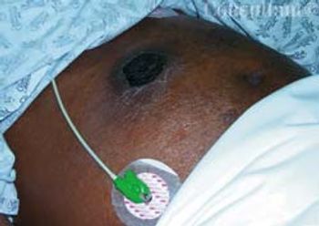 A 78-year-old man with a history of asthma, coronary artery disease, chronic obstructive pulmonary disease (COPD), and recently diagnosed prostate cancer was admitted to the medical ICU with exacerbation of COPD. The obtunded patient was unable to provide a history. A 4 × 6-cm firm nodule of unknown duration was noted over the right upper quadrant of the patient’s abdomen. There were no other cutaneous lesions.