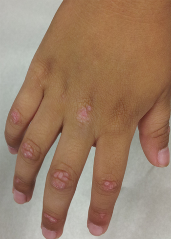 A 5-year-old boy had pain and weakness in his legs and had trouble climbing stairs. He had a dramatic rise in CPK followed by erythematous papules on the hands, as shown, and a rash around the eyelids. Which diagnosis is most likely?