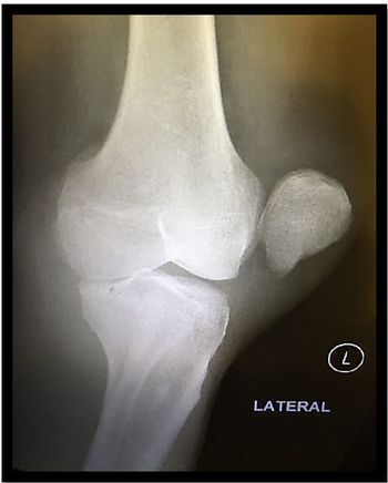 A 44-year-old man arrives at the ED via ambulance complaining of knee pain and inability to bend or fully straighten his left leg. He had been in a wrestling competition.