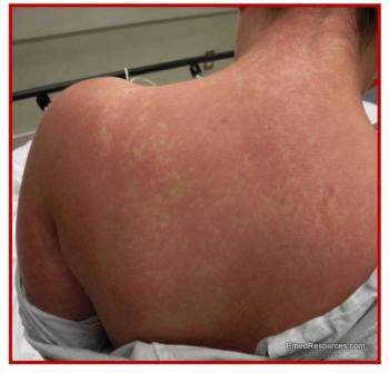 The pruritic rash covers much of the 23-year-old's body. Other than a recent UTI, PMH is negative. Do labs help with your Dx?
