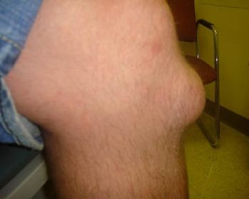 For 2 months, a 29-year-old man had pain and circular, soft swelling (7 x 7 cm in diameter) over the anterior left knee, superficial to the patellar ligament. Your dx?