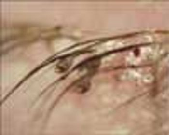 For several months, a 45-year-old woman has had ocular irritation, tearing, blurred vision, and swelling of the eyelids in both eyes. A close-up view of her eyelashes is shown here.