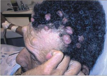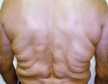 The multiple, symmetrically distributed, soft, nontender swellings on the shoulders and torso of a 56-year-old Hispanic man are characteristic of multiple symmetric lipomatosis (MSL), also known as Madelung disease or Launois- Bensaude syndrome.