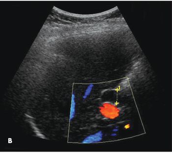 A 60-year-old woman with a 3-month history of progressively worsening epigastric pain was referred for elective cholecystectomy after ultrasonography showed findings consistent with chronic cholecystitis (A and B). The patient reported having postprandial abdominal discomfort since 4 years of age. She also had occasional nausea and vomiting but denied jaundice, change in bowel habits, or urinary symptoms.