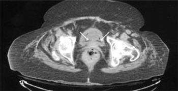 A 61–year–old man presented to the emergency department with diffuse lower abdominal pain, nausea, and severe diarrhea (20 episodes within the past 12 hours). His symptoms began the night before and had gradually worsened. He denied fever. His medical history was significant for hypertension.