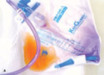 The purple-stained urine bags and tubing of 2 elderly patients are shown here. Neither patient received urine-discoloring medications.