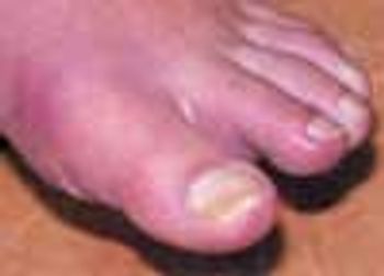 For 2 days, a 60-year-old man with a history of gout had excruciating pain in the left big toe. During 2 previous episodes, colchicine had relieved his symptoms. On this occasion, colchicine failed to provide relief. The patient's first metatarsophalangeal joint of the left foot was erythematous, hot, and tender. He could not bear weight on the foot. Other physical examination findings were normal.
