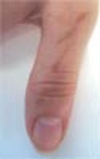 One week earlier, these asymptomatic linear brown streaks had appeared on the dorsal aspect of a 28-year-old woman's right thumb. When Ted Rosen, MD, of Houston questioned the patient about her recent activities, she said that she had just returned from a vacation in the Caribbean. During the trip, she had squeezed fresh limes into various beverages.