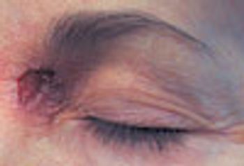 A 50-year-old woman was concerned about a nonhealing, painful lesion on the medial aspect of the left side of the nasal bridge. The lesion had been present for several weeks. The patient believed that a "cyst" had developed in the area. She had been attempting to remove it manually.