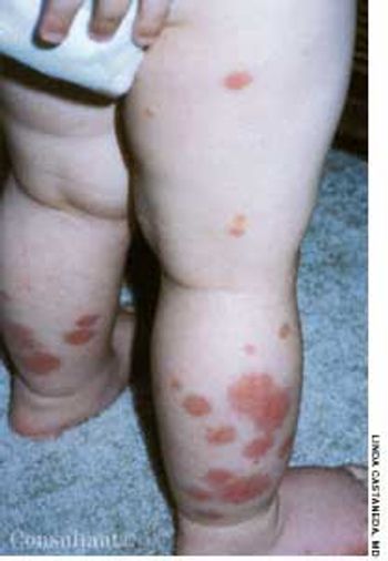An otherwise healthy 18-month-old boy presented with palpable purpura over the legs, arms, and buttocks; his face, neck, and trunk were spared. The patient was otherwise asymptomatic, alert, and playful. His mother reported that the child had a “stuffy nose and cough” 1 month earlier.