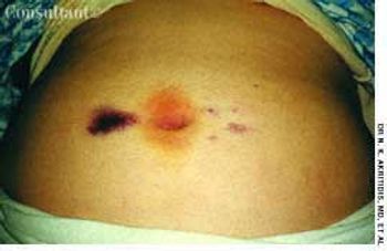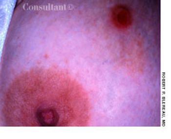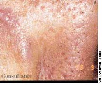 A 44-year-old woman had a painful, burning rash for 4 months. The erythematous eruption was evident on the thighs, fingers, buttocks, abdomen, and perineal and intergluteal areas. Application of triamcinolone cream and emollients offered no relief.