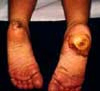 A 6-year-old girl presented with a huge ulcer on her right heel, seen here, that began as a minor laceration when she stepped on a rock several months earlier. On the left heel, there was a similar lesion in the process of healing that had also followed a minor injury. Her feet and hands were dry and hyperkeratotic.