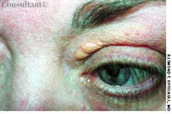 Concerned about the yellow plaque on his upper eyelid, a 45-year-old man sought medical evaluation. The slow-growing, asymptomatic lesion had developed several months earlier.