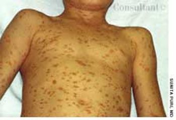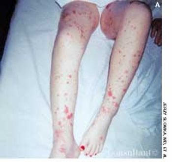 A 6-year-old girl was evaluated in the emergency department for a leg rash that had spread to the buttocks. The lesions first appeared earlier in the day and worsened hourly. The child's mother reported that her daughter was in good health until a low-grade fever, nonproductive cough, sore throat, and headache developed 5 days earlier. The youngster also complained of neck pain with movement.