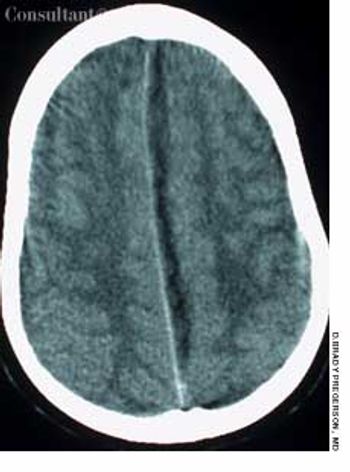 For 7 days, a 10-year-old boy had had a headache and a fever (temperature, 38.8°C [102°F]); a viral upper respiratory tract infection had been diagnosed. His parents brought him to the emergency department when weakness in his right leg developed, which impaired walking.