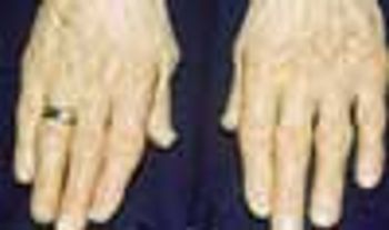 The 83-year-old woman whose hands are shown in photograph A had a severe flare of arthritis in the metacarpophalangeal and proximal interphalangeal (PIP) joints after corticosteroid therapy for her asthma was stopped. The clue to the diagnosis of psoriatic arthritis is in her fingernails, which show both pitting and onycholysis.