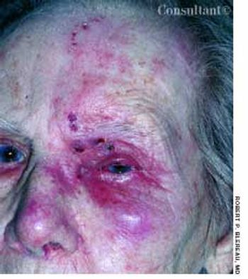Periorbital, forehead, and nasal erythema, crusting, and pain typical of herpes zoster affected a 90-year-old woman. Reactivation of the latent varicella zoster is more common in the elderly and is attributed to impaired immunologic mechanisms.