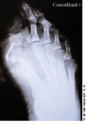 A 72-year-old woman was hospitalized after 8 years of pain and swelling of the right metatarsophalangeal joint. (In this film, the dark area over the distal joint of the large toe is an artifact.) Results of a purified protein derivative tuberculin test were positive, and a chest film revealed apical changes compatible with old tuberculosis (TB).