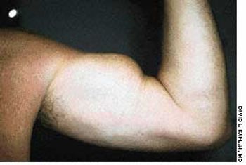 The unusual muscle definition in this 57-year-old man was noted during a routine physical examination. The patient had myasthenia gravis, for which he previously had been treated with prednisone.
