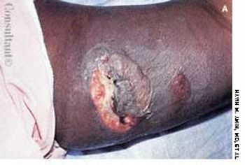 A 42-year-old woman was hospitalized with an increasingly painful, ulcerated swelling of the right lateral thigh. The patient reported that while cleaning out her attic, she suddenly experienced an excruciating burning sensation in her thigh. Immediately, she rubbed the area with ice, which provided partial relief. An ulcer developed 24 hours later and began to enlarge.