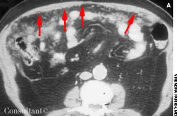 Vague abdominal pain, malaise, anorexia, and the loss of 10 lb in 2 months prompted a 65-year-old man to seek medical evaluation. A year earlier he had undergone surgery for stage III carcinoma of the sigmoid colon. Because metastases to the lymph nodes were found in the resected colon, the patient was given postoperative chemotherapy. Histologic examination revealed poorly differentiated adenocarcinoma.