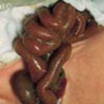 An infant born to a 25-year-old gravida 2 para 1 mother by cesarean section at 36 weeks' gestation had loops of small intestine protruding from the abdominal cavity.