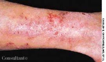 A 40-year-old man presented with tiny, intensely pruritic vesicles on the knees, legs, buttocks, elbows, and scalp.