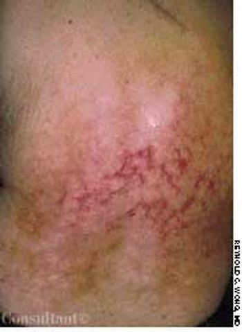 An area of mottled skin developed on the back of a 55-year-old woman who has had arthritis for several years. She often applied a heating pad to her middle and lower back for relief from arthritic pain.