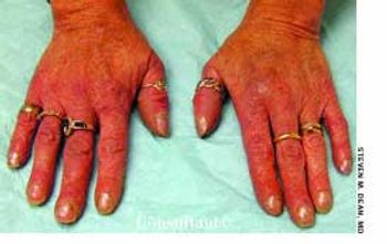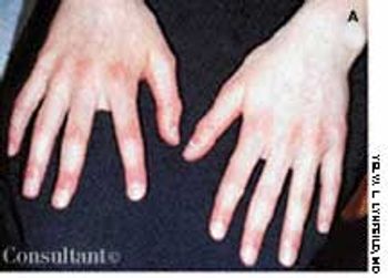 Evaluation of intermittently discolored, cold fingers was sought by a 39-year-old woman with long-standing anorexia nervosa. The patient had never smoked and was not taking any vasoconstrictive drugs.